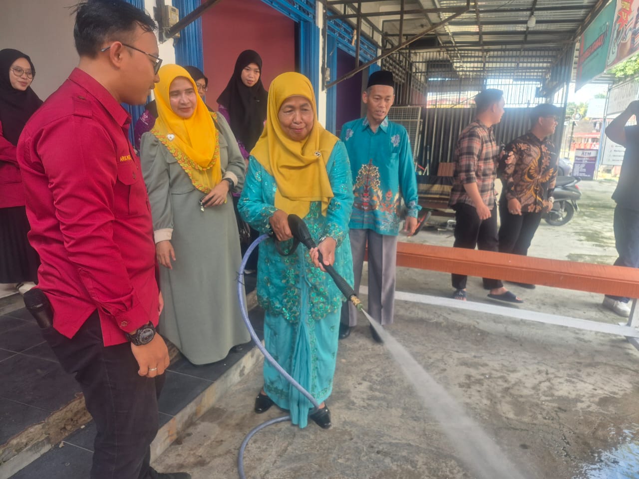 Ibu Kaminem diberi kehormatan untuk melakukan penyemprotan perdana sebagai tanda sudah beroperasinya pencucian sepeda motor Autentik Steam Wash.